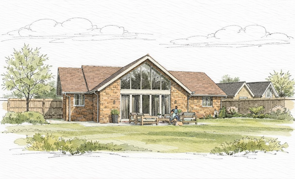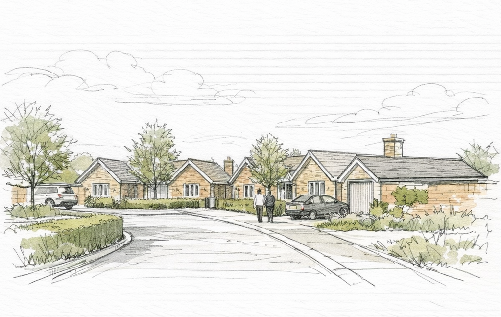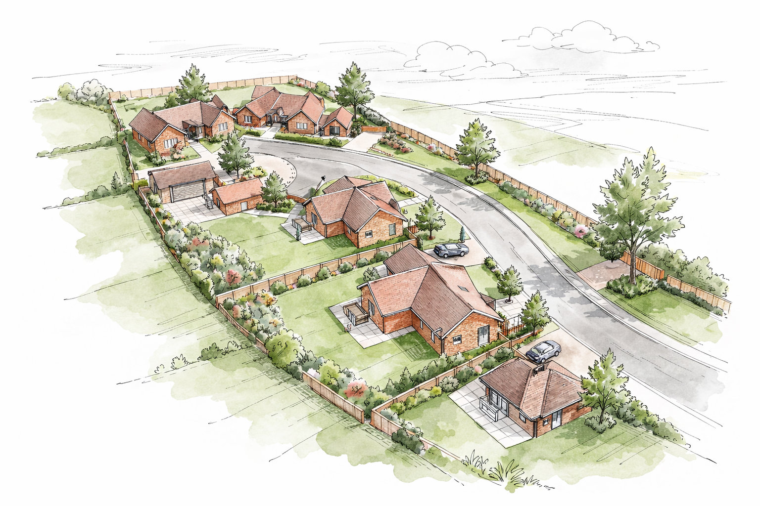 The design was carefully developed to achieve a low-density, bungalow-scale arrangement, with particular emphasis on proportion, internal spatial quality and buildability. The layout responds to the site’s edge-of-settlement character, using a calm cul-de-sac form and landscape structure to contain development and minimise its visual impact.