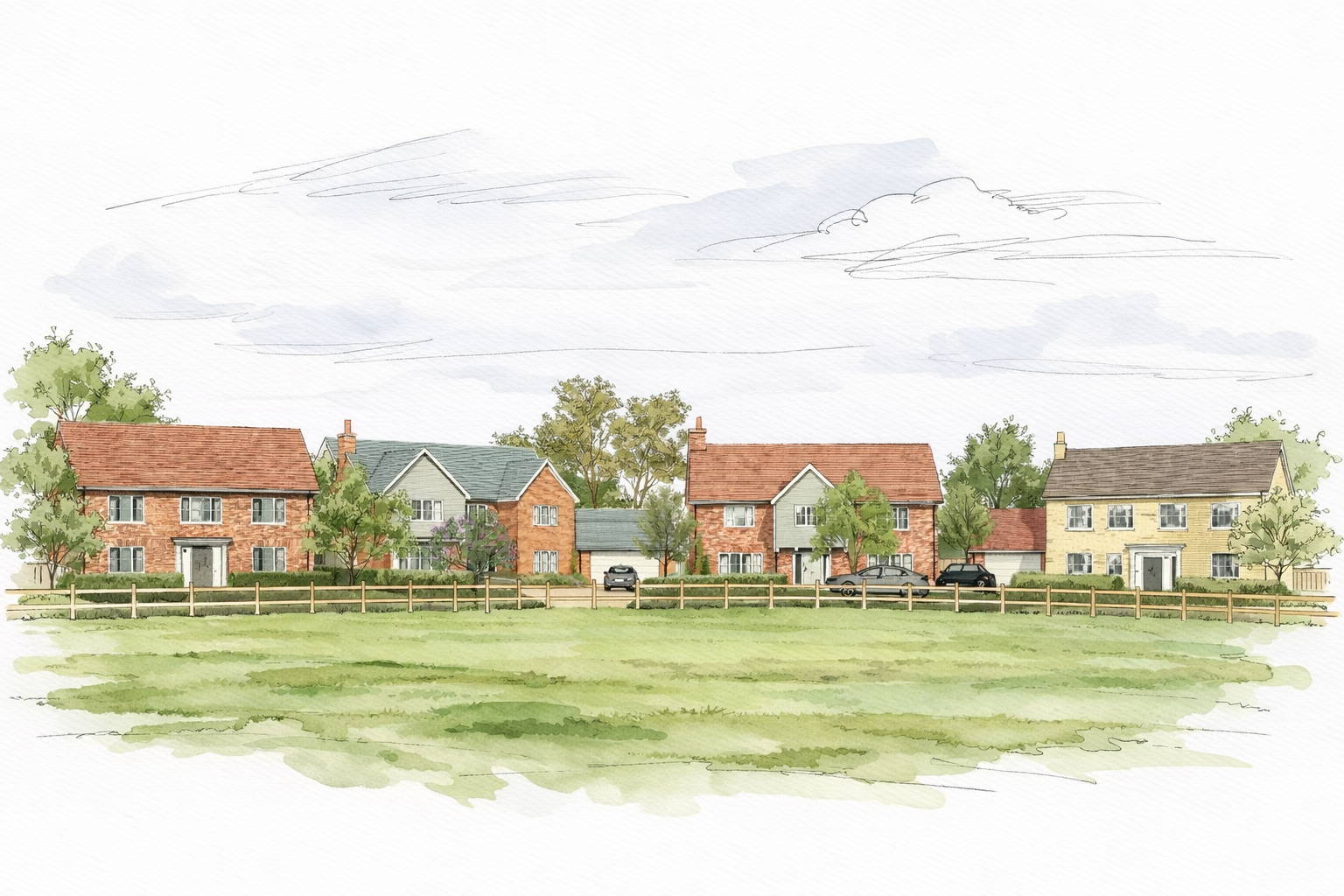Architecturally, the homes adopt a restrained vernacular, with varied rooflines, chimneys and articulated elevations to create visual interest while maintaining coherence across the development. Parking is carefully integrated through garages and private drives, ensuring streets remain calm and pedestrian-friendly.